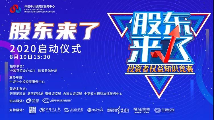 《股东来了》2020投资者权益知识竞赛活动,由中国证监会办公厅、投资者保护局指导,中证中小投资者服务中心携手天津证监局、湖南证监局、安徽证监局、内蒙古证监局和中证资本市场法律服务中心共同主办。