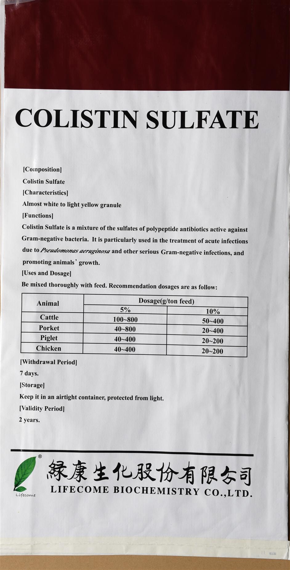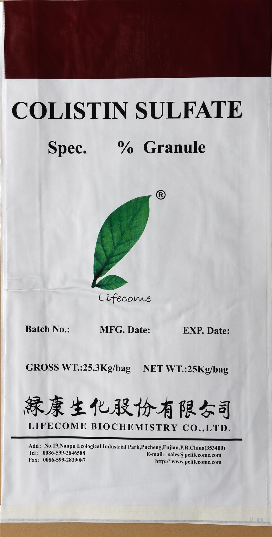 • Colistin Sulfate 10% Granule25kg per bag is marketed by Lifecome Biochemistry Co. with multi-wall bag.
