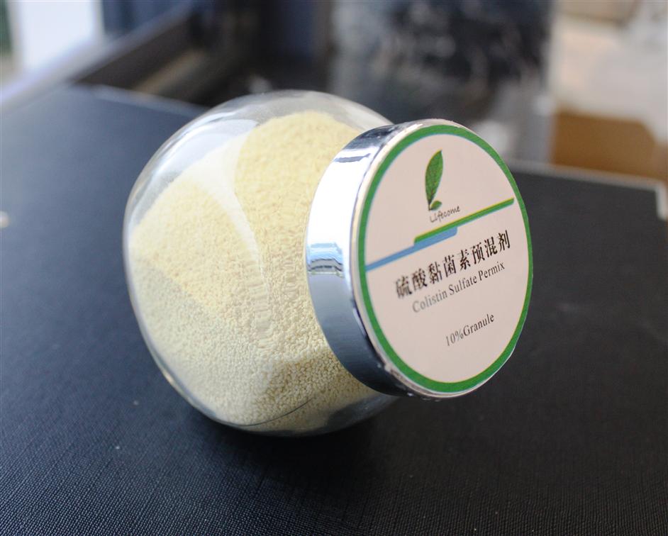 Colistin Sulfate 10% Granuleis a granulated premix containing 100 g (activity) of colistinper 1 kg of product. Colistin Sulfate 10% Granuleis used for manufacturing complete feeds for broilers, laying hen, swineand cattle.